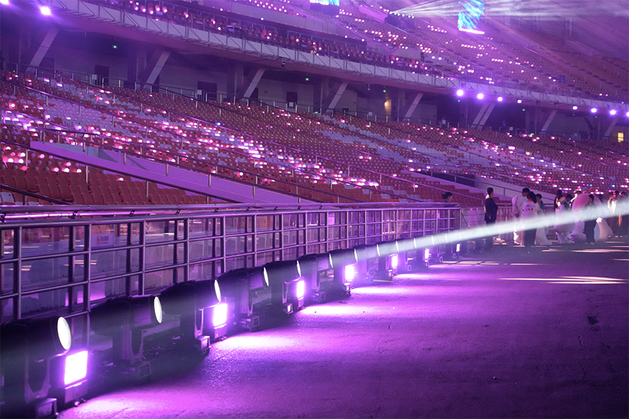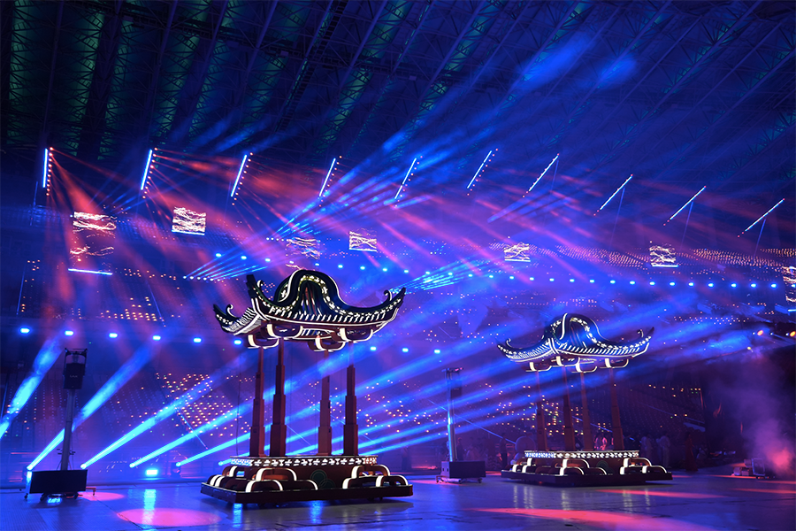亮灯仪式上,广州塔、东塔、西塔首次实现三塔联动上演璀璨光影秀,一头集现代光雕技术与传统美学于一身的“鳌鱼”成为全场焦点,其流光溢彩的身姿盘桓而起,以磅礴气势点亮花城夜空。主舞台更是突破传统的局限,以观众席方向为主舞台,将传统岭南文化与现代科技有机融合,通过科技机器狗、灯光狮等创新元素与多元表演,打造了一场演员与观众双向奔赴的沉浸式盛宴,完美实现了艺术表达与全运活力的交融。