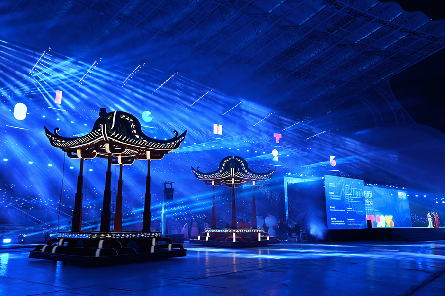 亮灯仪式上,广州塔、东塔、西塔首次实现三塔联动上演璀璨光影秀,一头集现代光雕技术与传统美学于一身的“鳌鱼”成为全场焦点,其流光溢彩的身姿盘桓而起,以磅礴气势点亮花城夜空。主舞台更是突破传统的局限,以观众席方向为主舞台,将传统岭南文化与现代科技有机融合,通过科技机器狗、灯光狮等创新元素与多元表演,打造了一场演员与观众双向奔赴的沉浸式盛宴,完美实现了艺术表达与全运活力的交融。